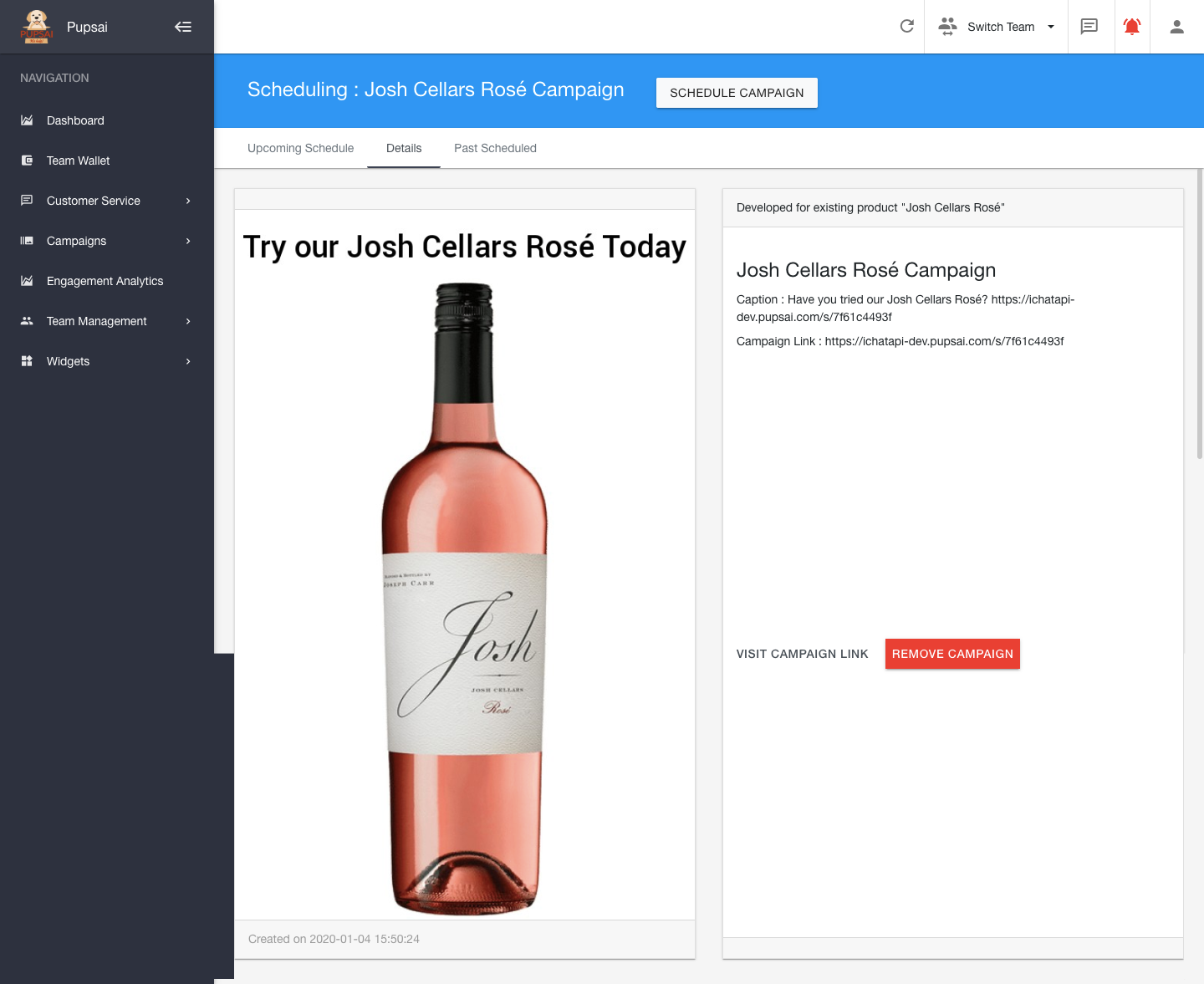 - You'll be redirected to the "Scheduling Campaign" page. Where you can, visit the campaign link, remove the campaign or schedule the campaign. See image below